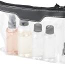 These prices are only a guide and can vary based on your qty and branding needs.The Munich airline approved PVC travel toiletry bottle set with bag, which is suitable to take on board of a plane. Includes 2 x 50 ml screw on lid bottles, 1 x 90 ml screw on lid bottle and 1 x spray pump vaporiser and funnel. The bottles, vaporiser and funnel are packed in a poly bag and comes separately from the pouch. Decoration not available on components. Available with a black or white trim and is suitable for a 1 colour print only.