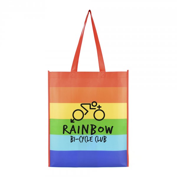 These prices are only a guide and can vary based on your qty and branding needs.Our brightly coloured eco-friendly 80gsm non-woven PP shopper has a horizontal rainbow print, gusset and long handles. Comes with a large print area to really compliment your logo or message. Suitable for single spot colour only.