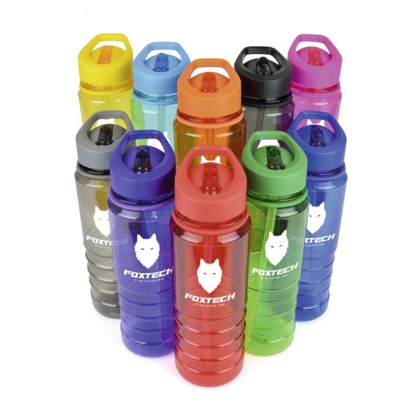 These prices are only a guide and can vary based on your qty and branding needs.Make the Tarn coloured single walled sports bottle the ultimate travelling companion. With its large 750ml coloured translucent body made from PET plastic, a colour coordinated AS plastic fold down mouth piece, decorative band and a secure PP plastic screw on lid which acts as a carry grip. The bottom half of the bottle is ridged, for ease of grip. Available in a range of 10 beautiful colours. Can be printed up to a 2 spot colour print or a full colour digital print.