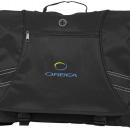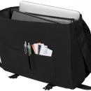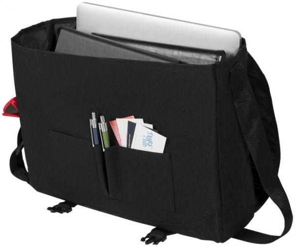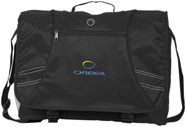 These prices are only a guide and can vary based on your qty and branding needs.Track 15.6" Computer Messenger. 15.6" computer messenger bag with padded laptop sleeve. Features a zipped organisational pocket, a mesh water bottle pocket and a panel with slash pockets and pen loops. The front flap with double clip closure features an earbud port, a zipped front pocket and white accent stitching. The messenger also includes a trolley sleeve at the back and an adjustable shoulder strap. 600d Polyester.