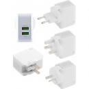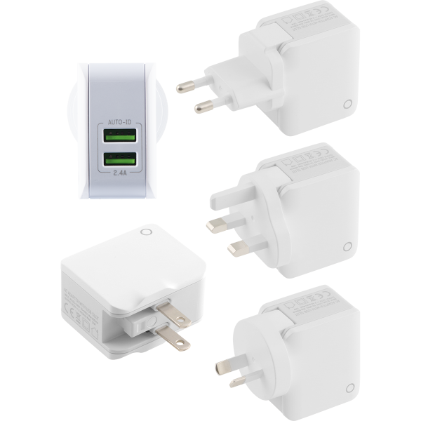 These prices are only a guide and can vary based on your qty and branding needs.High quality USB travel adaptor conforming to British Standards 1363 and supplied with adaptors for use in Australia, Europe and the U.K., as well as having integrated pins for use in the U.S. and China. The adaptor is fitted with two USB ports, one using Auto-ID technology to automatically detect the current of the device it is charging. The other port has an output of 2.4A. Two devices can be charged at the same time. On the front side of the adaptor there is a light to indicate when the product is switched on. Product is ROHS & CE certified and supplied in bulk retail packaging.